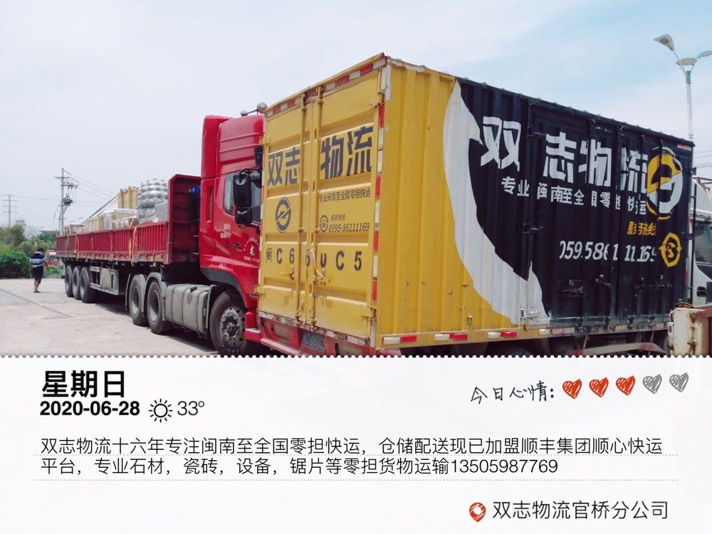 發(fā)布信息: 水頭雙志物流十六年專注閩南至全國(guó)零擔(dān)快運(yùn),現(xiàn)已加盟順豐集團(tuán)順心快運(yùn)平臺(tái),專業(yè)石材、瓷磚、設(shè)備、鋸片等零擔(dān)貨物運(yùn)輸。本物流專線福建到全國(guó)各地線路零擔(dān)整車(chē) 運(yùn)輸業(yè)務(wù),零擔(dān)隨時(shí)上門(mén)提貨,天天發(fā)車(chē),價(jià)格合理!專注全國(guó)石材瓷磚配件零擔(dān)直達(dá)快運(yùn)及閩南地區(qū)同城零擔(dān)配送一日達(dá),順豐集團(tuán)順心平臺(tái)各種零擔(dān)貨物10公斤起收,電商平臺(tái)入倉(cāng),大件送貨上樓,全國(guó)無(wú)盲區(qū),十六年專業(yè)值得您的托付!公司秉承客戶至上,服務(wù)的理念! 歡迎各位新老朋友來(lái)電洽談! 手機(jī)微信同號(hào):13505987769/15905908260李(女士)