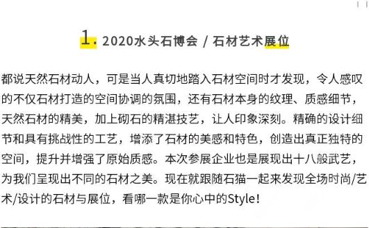 商圈 > 大理石 > 2020水頭石博會(huì),石貓與你發(fā)現(xiàn)石材藝術(shù)展位!