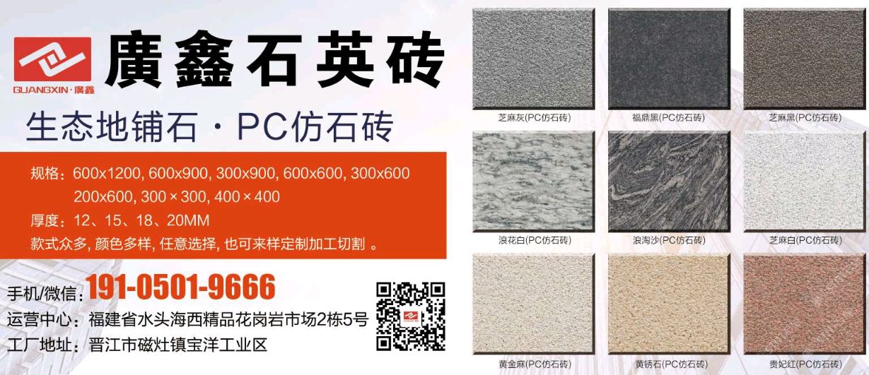 廣鑫石英磚/PC磚 聯(lián)系人:劉    134****2000 查看 手機(jī)號(hào)碼:無(wú) 主營(yíng)范圍: 花崗巖加工、石材外貿(mào)、更多、環(huán)境石材、大理石加工、 企業(yè)地址:福建泉州福建省泉州市南安市水頭鎮(zhèn)海西石材城海五路1-81\\n