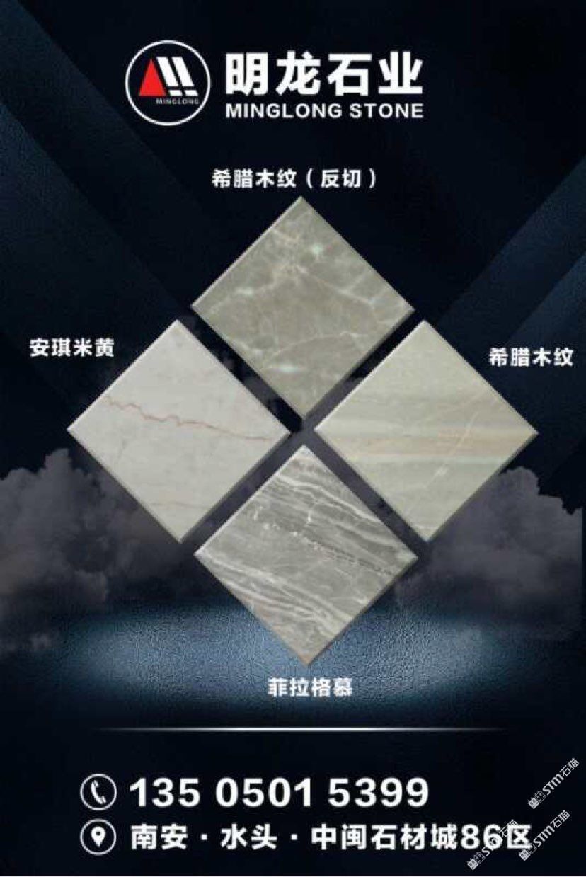 明龍石業(yè) 聯(lián)系人:黃小姐    135****5399 查看 135****5399 查看 主營范圍: 礦山、大板批發(fā)、荒料、異型加工、 企業(yè)地址:福建泉州南安市水頭鎮(zhèn)正飛鑫泰石材城6號門A13區(qū)