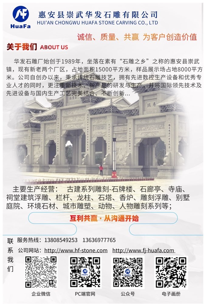 惠安縣崇武華發(fā)石雕有限公司 聯(lián)系人:劉喜洋    138****9253 查看 159****3722 查看 主營范圍: 石材雕刻、石材工藝品、花崗巖加工、異型加工、石材工程資質(zhì)企業(yè)、 企業(yè)地址:福建泉州惠安縣S312(惠崇公路)華發(fā)石雕