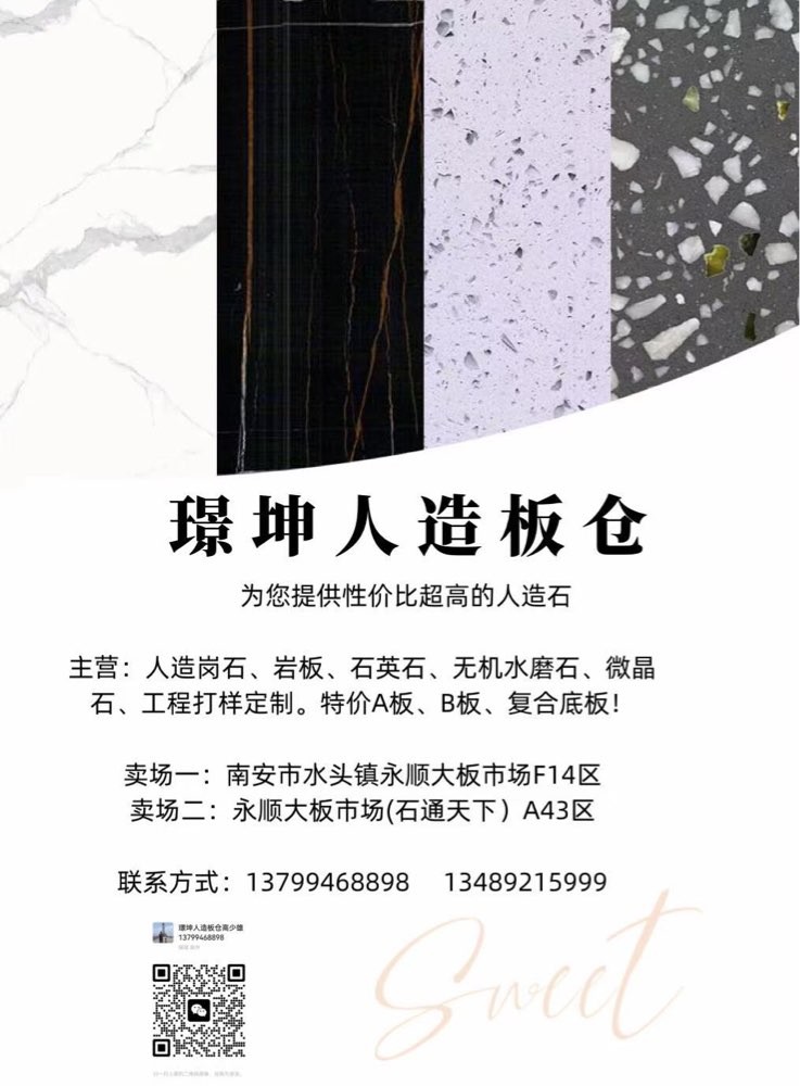 發(fā)布信息: 一璟坤人造板倉一 主營:人造崗石,石英石,巖板,無機水磨石, 微晶石,工程打樣定制,特價A板,B板,復(fù)合底板 賣場地址:福建省南安市水頭鎮(zhèn)永順大板市場A43區(qū),F(xiàn)10一F14區(qū)。財富熱線:13799468898高先生
